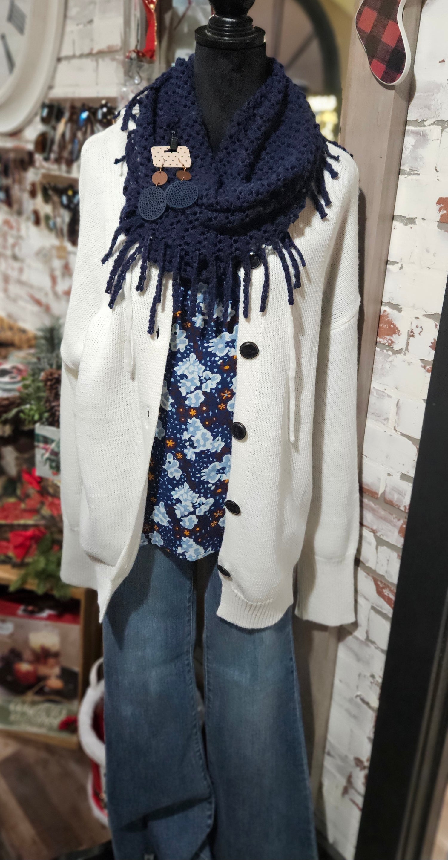 Delilah is bundled up in a winter-ready look that’s cozy, flattering, and easy to wear anywhere, whether you’re headed to work, grabbing coffee with friends, or running errands around town. The boot-cut Judy Blues pair perfectly with a navy patterned top, layered under a soft ivory button-up hooded cardigan and finished with a chunky navy scarf and coordinating earrings.