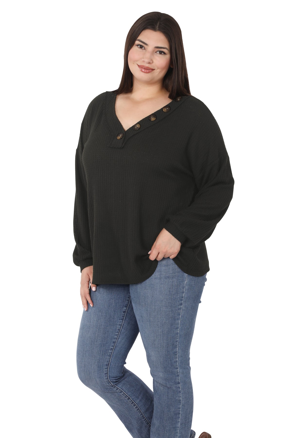 Wrap yourself in luxurious comfort with our Brushed Waffle V-Neck featuring exquisite button details. Crafted from a soft and warm fabric, this versatile piece is a must-have for your wardrobe. Perfect for cozy nights in or casual outings, this top offers both style and comfort. The brushed waffle texture adds a touch of sophistication while keeping you snug and stylish. Elevate your everyday look with this chic and cozy V-neck. Indulge in comfort and style – add this versatile piece to your collection today!