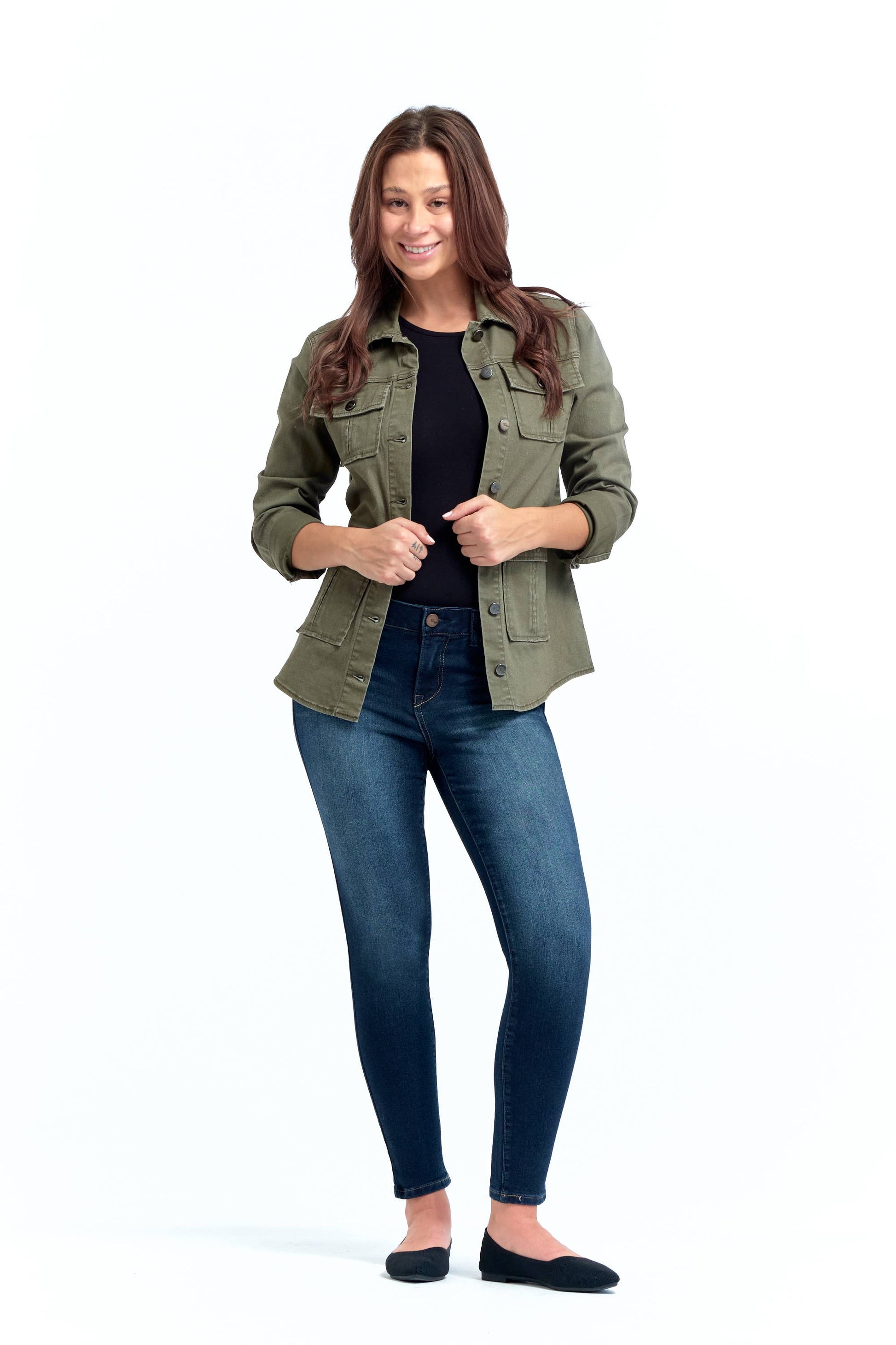 Step up your style game with our stretchy denim utility jacket that seamlessly blends fashion and function. This military-inspired piece is a versatile wardrobe staple that effortlessly transcends seasons, ensuring you stay on-trend all year round. Featuring cargo pockets and a fitted design that sits low at the waist, this jacket exudes a cool, contemporary vibe. Whether you're running errands or heading out for a casual outing, this denim utility jacket is the perfect choice to elevate your look. Embrace the best of both worlds with this must-have addition to your wardrobe!