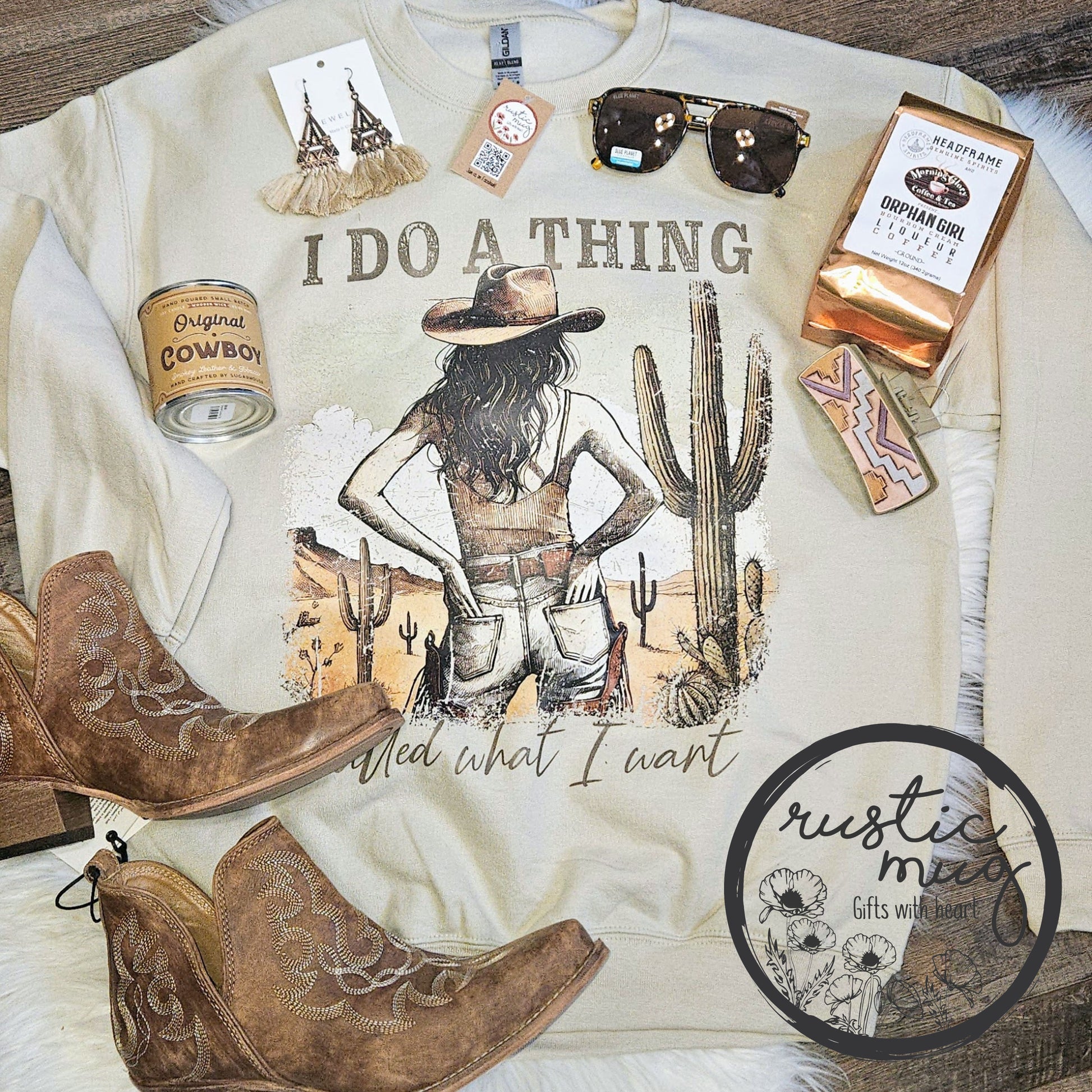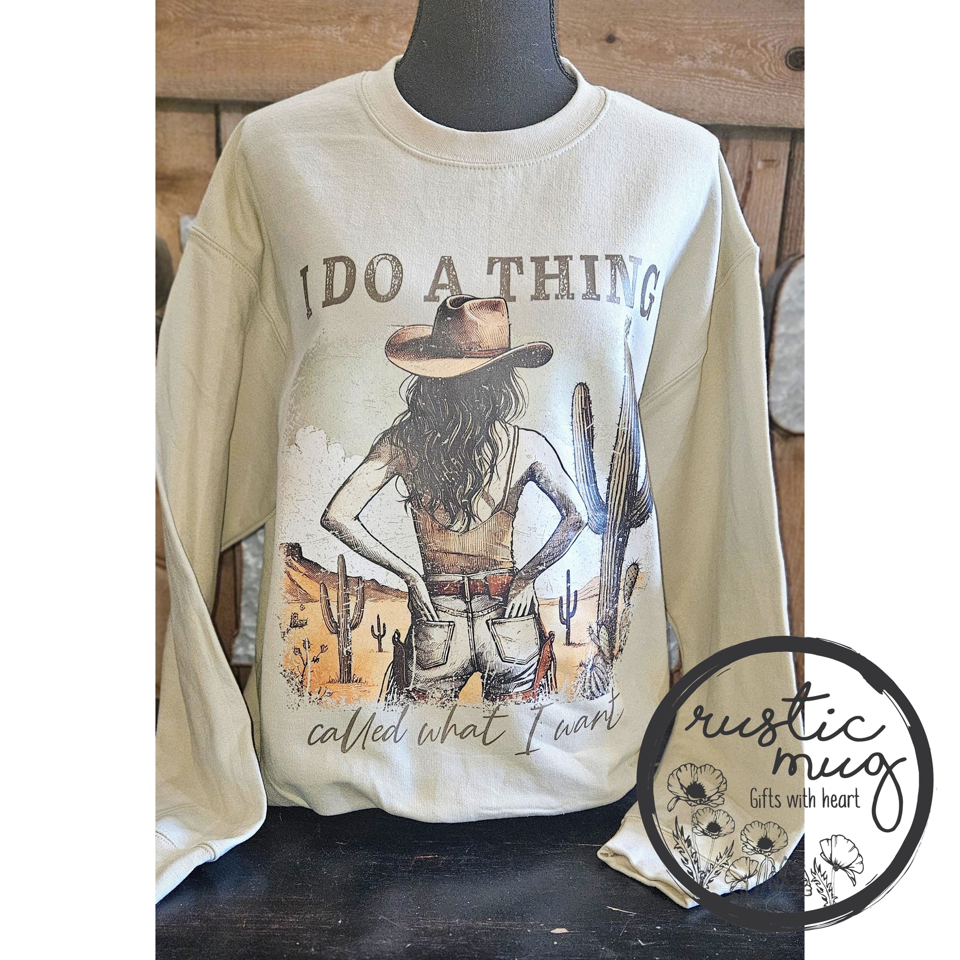 Make a bold statement with the 'I Do a Thing Called What I Want' Sweatshirt, designed for those who embrace their individuality with confidence and sass. This comfortable sweatshirt features a relaxed fit and soft fabric, perfect for all-day wear. Its unique design combines a sassy phrase with a touch of western-inspired charm, making it a standout addition to your wardrobe. Whether you're lounging at home or stepping out to show off your fearless style, this sweatshirt offers both comfort and personality. Express yourself effortlessly with this one-of-a-kind piece.