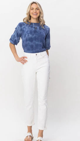 Introducing the Judy Blue Hi Rise Double Cuff Boyfriend Jeans in White: Effortlessly Chic and Versatile. Elevate your denim collection with the Judy Blue Hi Rise Double Cuff Boyfriend Jeans in White. These jeans offer a relaxed and stylish fit with a high-rise waist and a double cuff detail, all in a crisp white color. With their boyfriend fit and versatile white color, these jeans are perfect for creating a variety of chic and summery outfits. Dress them up with heels and a blouse for a polished ensemble, or keep it casual with sneakers and a graphic tee. Upgrade your denim collection with the Judy Blue Hi Rise Double Cuff Boyfriend Jeans in White and experience the perfect blend of comfort and style. Shop now and embrace the effortless elegance of these must-have jeans.