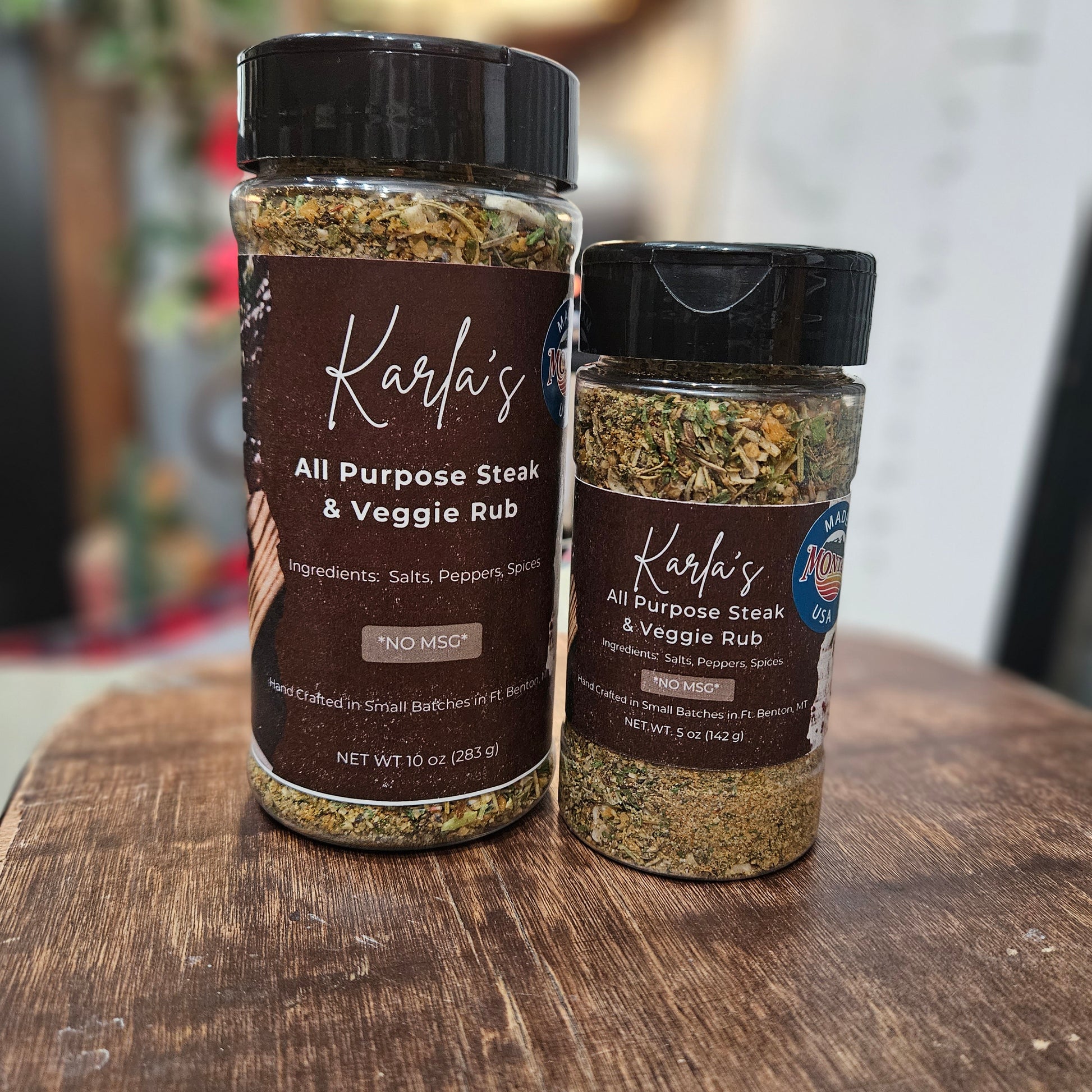 Jane Brooks Karla's All Purpose Steak & Veggie Rub is truly the best steak rub you will ever taste. It's good on almost anything! We discovered it during a visit to Karla's wonderful shop "The Rustic Mug" in Fort Benton, Montana, which is amazing. We loved the whole town, which is right on the Missouri River in Montana. Gorgeous. And now that we've tasted Karla's Steak Rub, we can't live without it, so we are ordering lots, and we're going to give some to our friends and family as gifts. It's really the best.