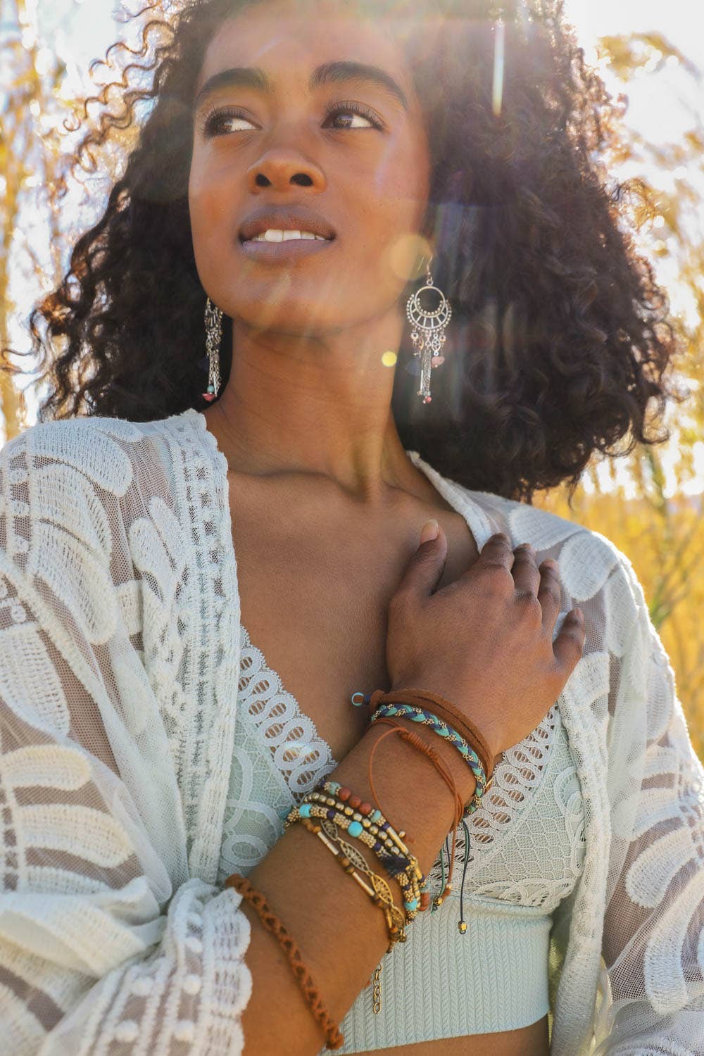 Indulge in the ethereal beauty of our Dangling Rose Quartz and Fringe Earrings, crafted for those who appreciate the allure of natural gemstones and crave unique designs. These earrings are a bohemian dream, embodying a free-spirited style that is both trendy and timeless. The mesmerizing rose quartz stones add a touch of elegance, while the playful fringe detail brings a fun and whimsical element to your look. Elevate your style and make a statement with these one-of-a-kind earrings that are sure to turn heads wherever you go. Embrace the magic of these earrings and infuse your wardrobe with a touch of bohemian chic!