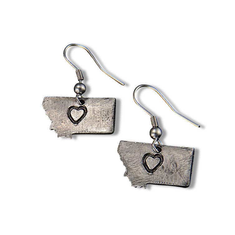Show off your love for Montana with these stunning pewter state earrings. Crafted with attention to detail, this necklace features the iconic shape of Montana, with and engraved heart. Made from high-quality pewter, this necklace is not only a stylish accessory but also a meaningful keepsake. Whether you're a proud Montanan or simply admire the state's natural beauty, this necklace is a must-have addition to your jewelry collection.