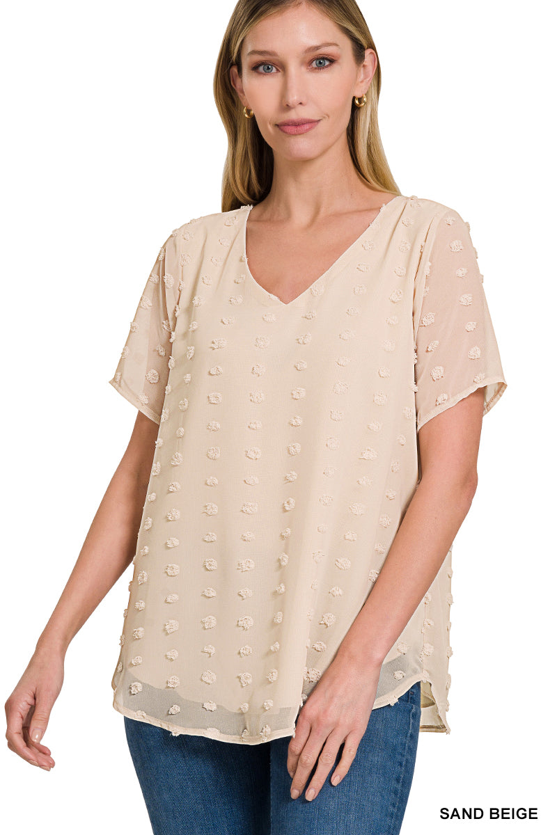 Add a touch of elegance to your wardrobe and elevate your fashion game with our Swiss Dot Short Sleeve V-neck Round Hem Top.