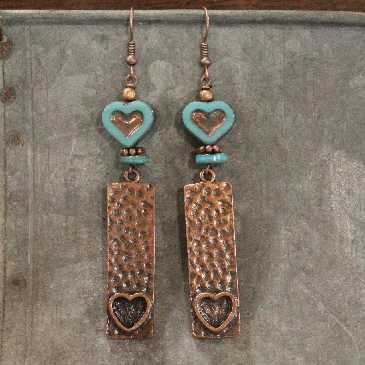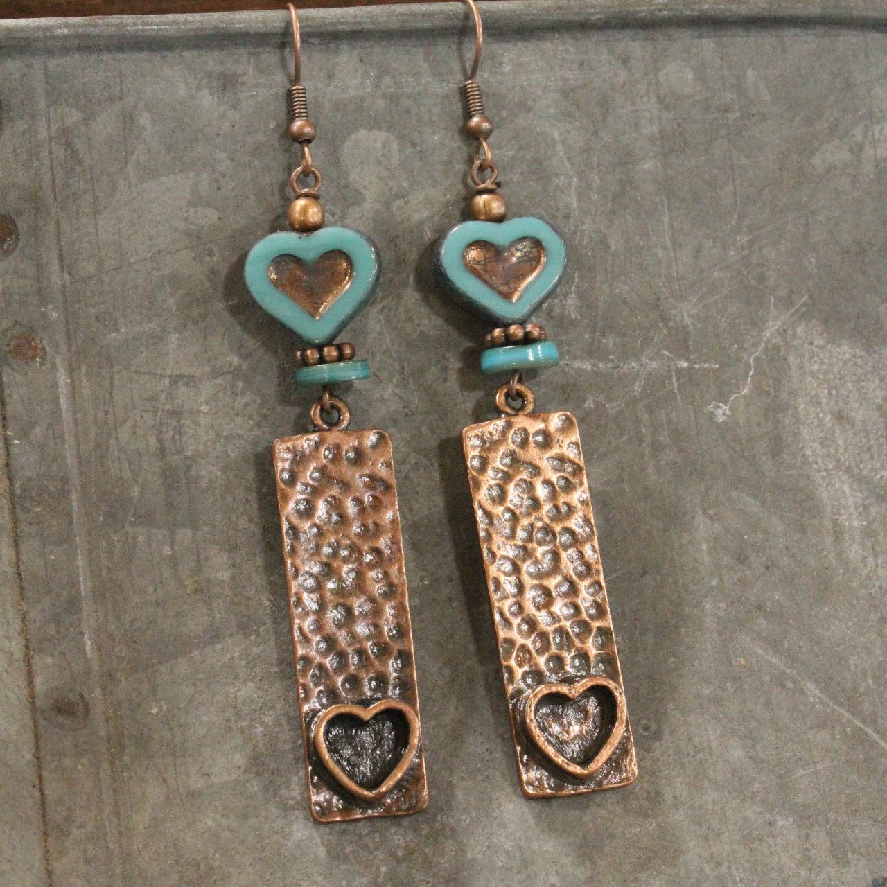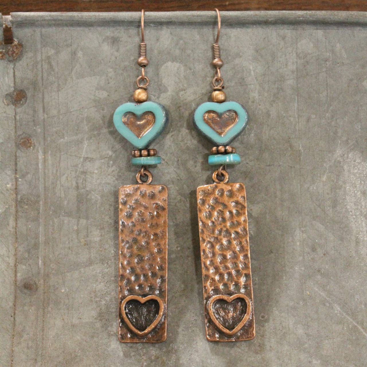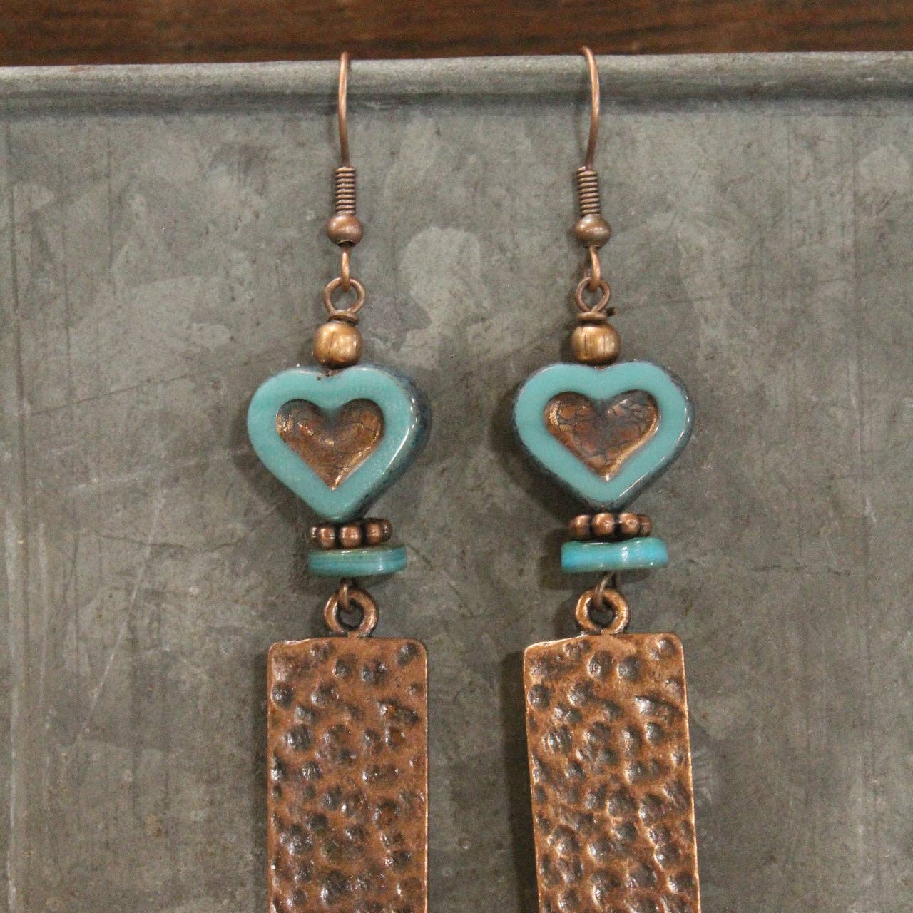 Indulge in the exquisite beauty of our Hammered Copper & Czech Heart Dangle Earrings. Each pair is meticulously handcrafted to perfection, showcasing a unique design that sets you apart from the crowd. Made with the finest materials, the hammered copper adds a touch of rustic charm, while the Czech heart dangles exude elegance and grace. These earrings are a true statement piece, perfect for adding a touch of sophistication to any outfit. Elevate your style with these one-of-a-kind earrings and let your personality shine through!