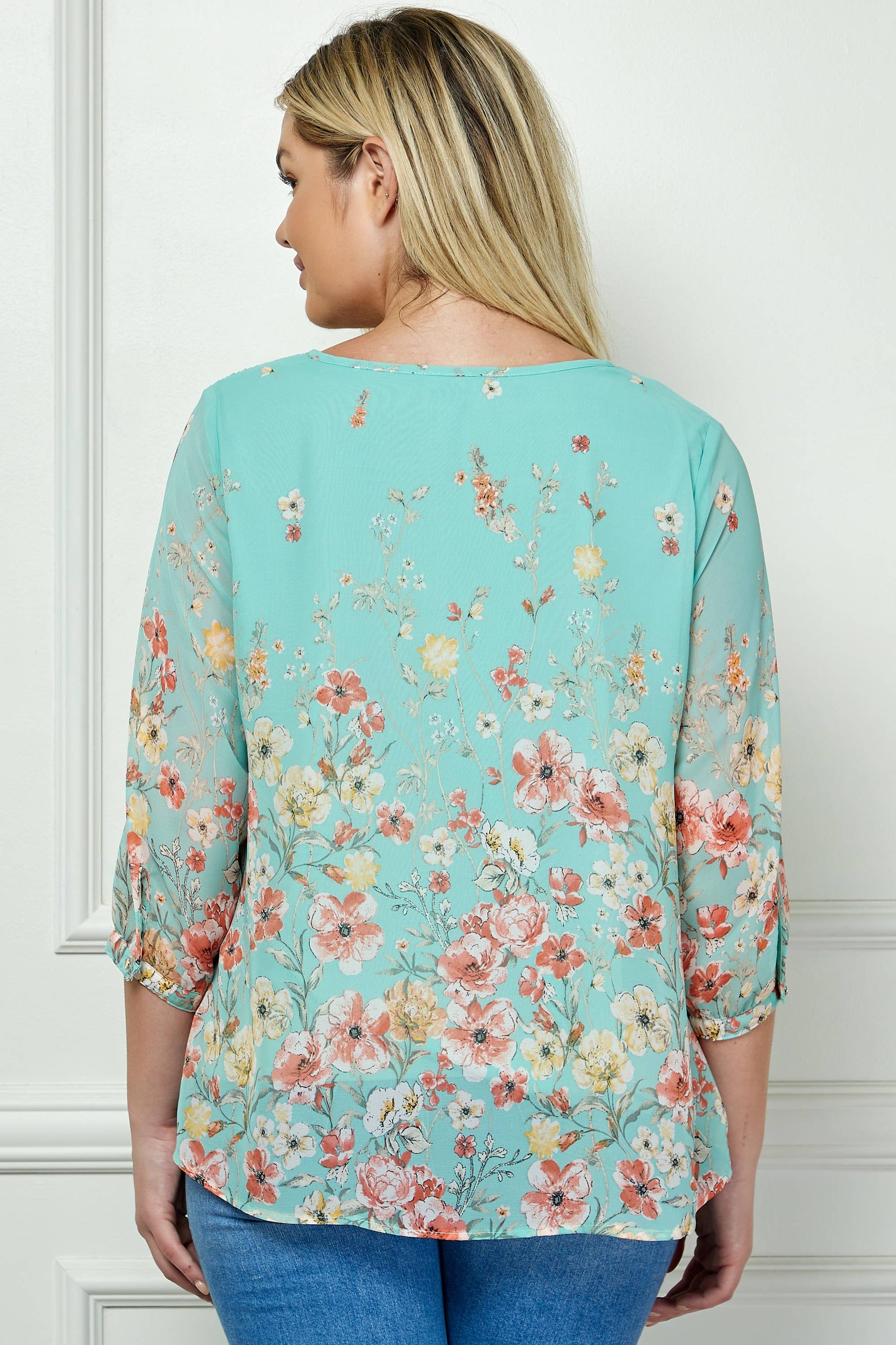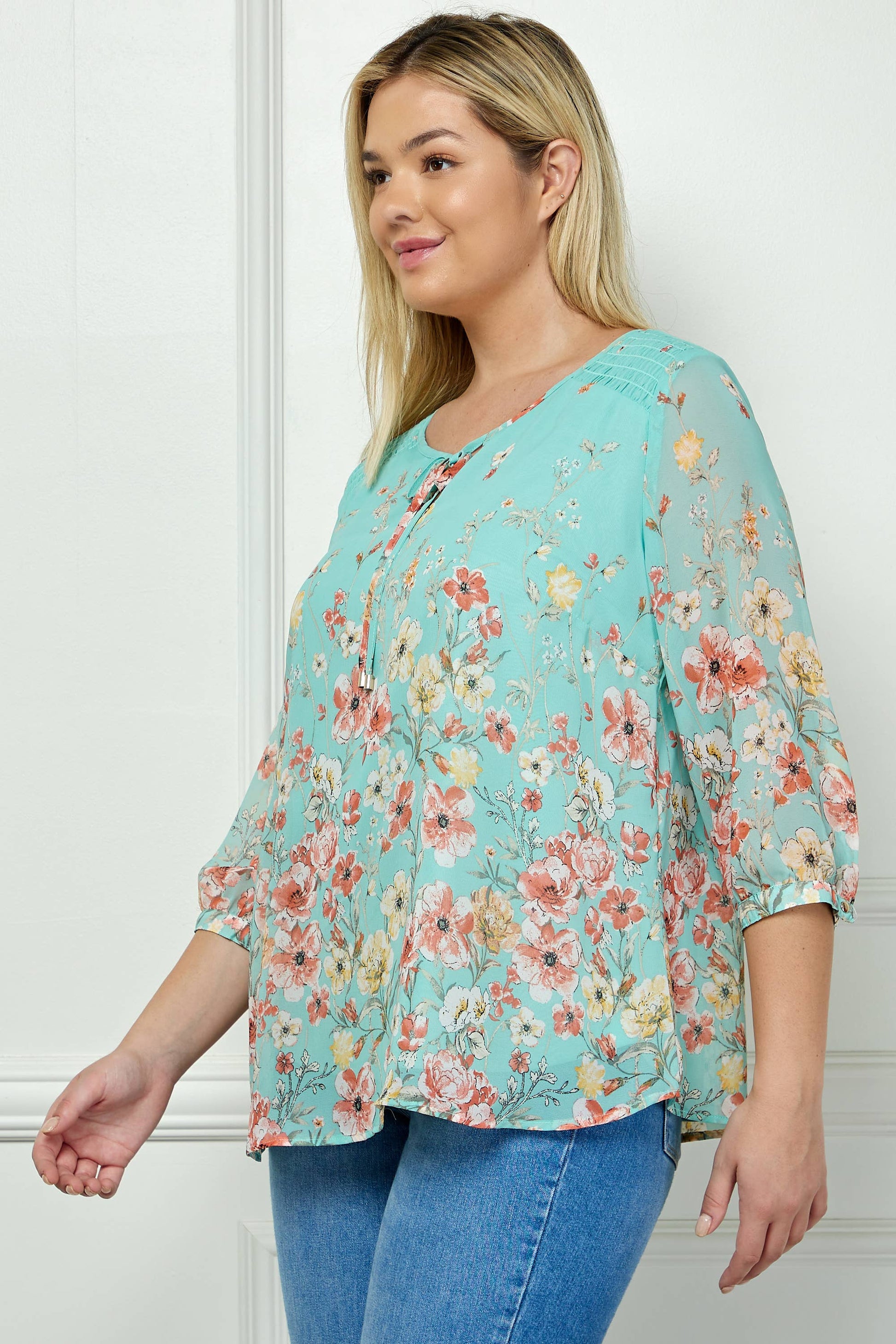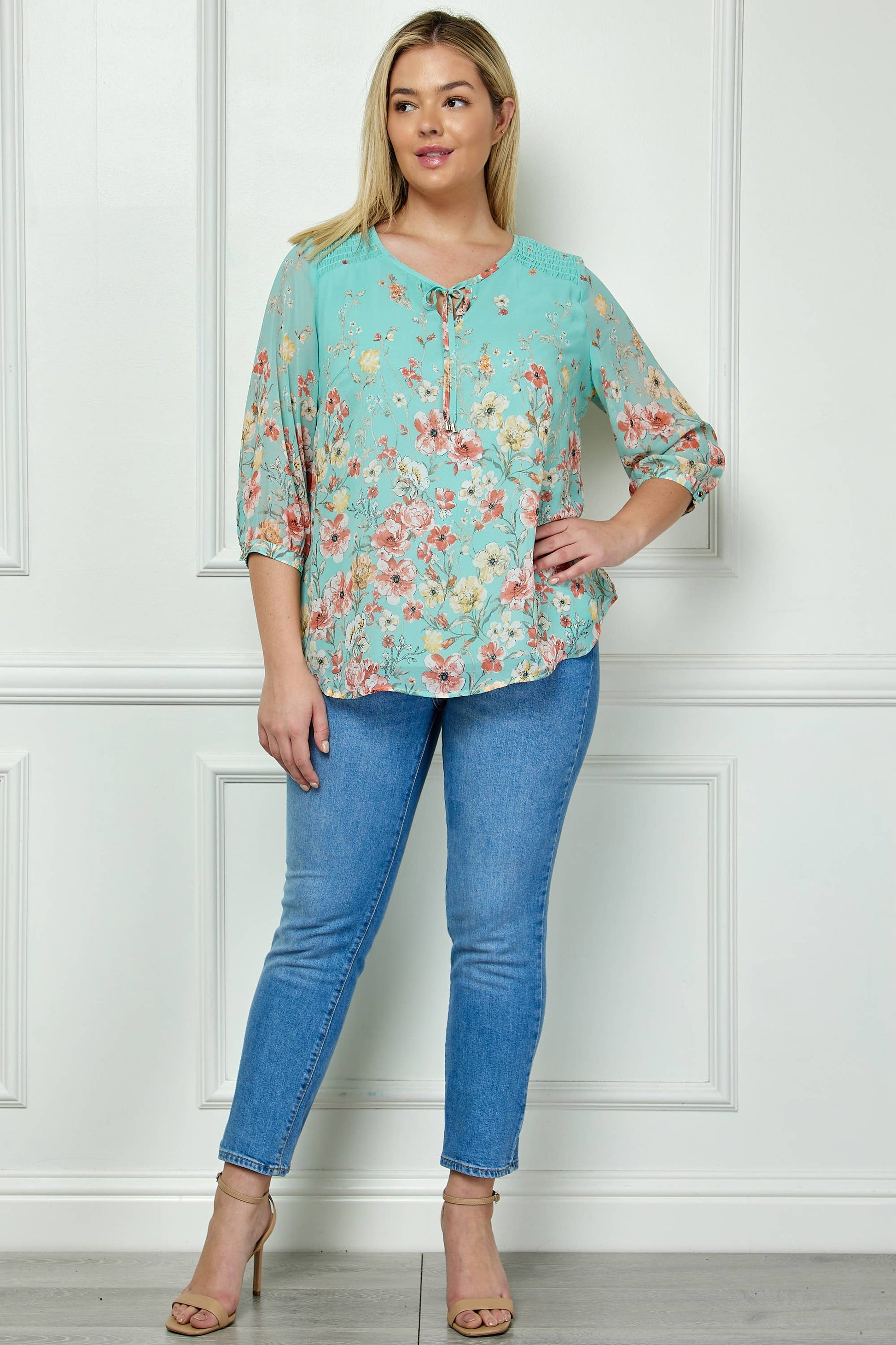 Make a statement with our stunning Seafoam Floral Top! This gorgeous piece showcases a one-of-a-kind design, complete with button cuff sleeves, a flattering scoop neckline, and smocked shoulders that add a touch of texture and style. The top is elegantly crafted with three-quarter length sleeves and charming spaghetti ties, making it a perfect choice for a fun and fashionable look. Whether you're heading to a brunch with friends or a casual day out, this top will effortlessly elevate your outfit with its unique flair. Don't miss out on this must-have wardrobe essential. Add the Seafoam Floral Top to your cart now and let your style bloom!
