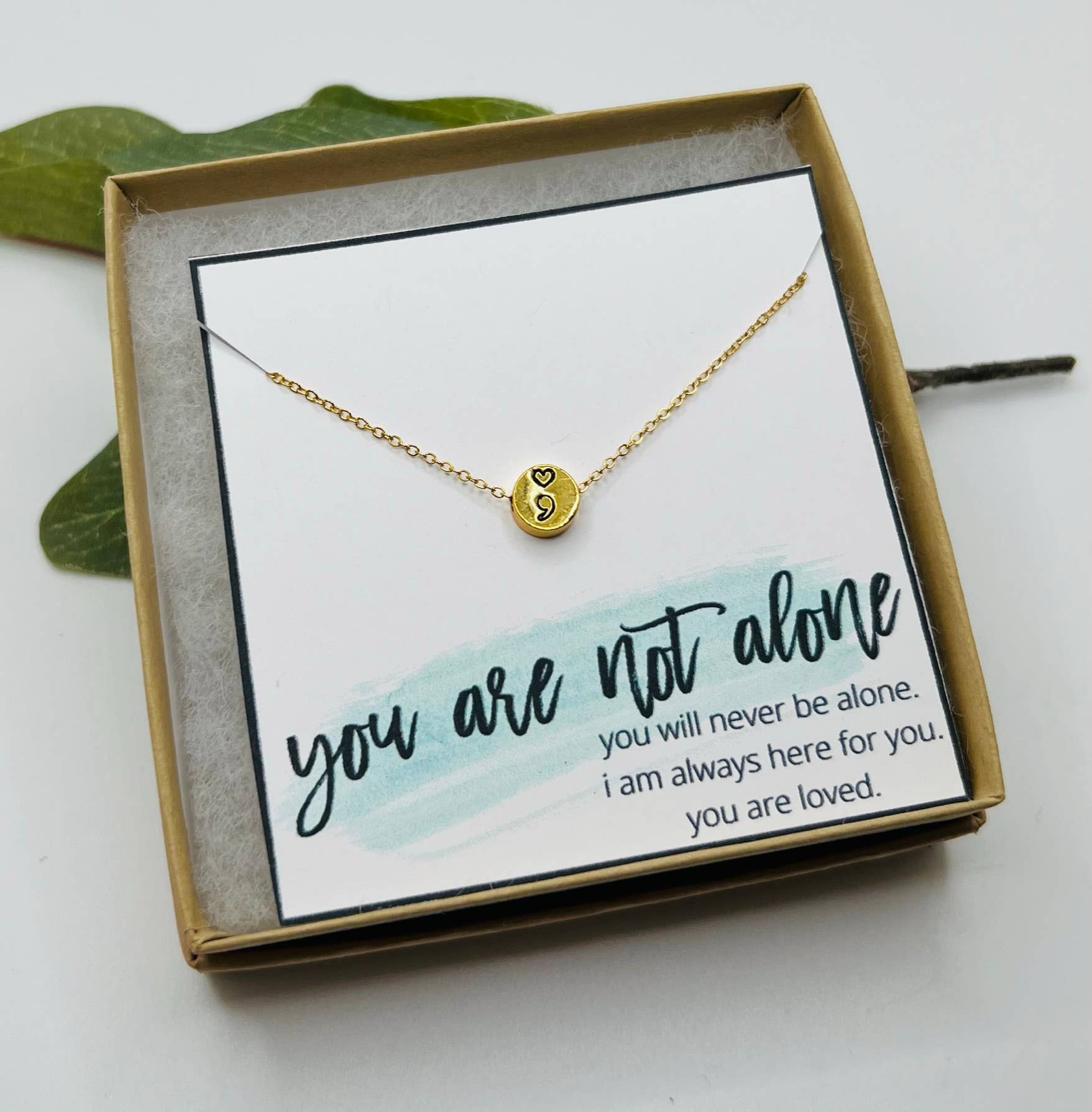The 'You Are Not Alone' Necklace is a thoughtful accessory designed to inspire strength and connection. Featuring a dainty design, this piece is crafted with high-quality materials for lasting durability and elegance. Its subtle yet meaningful message serves as a gentle reminder of support and solidarity; perfect for promoting mental health awareness. The lightweight construction ensures comfort for daily wear, while its timeless style pairs effortlessly with any outfit. A meaningful gift for yourself or a loved one, this necklace carries a powerful message of hope and unity.